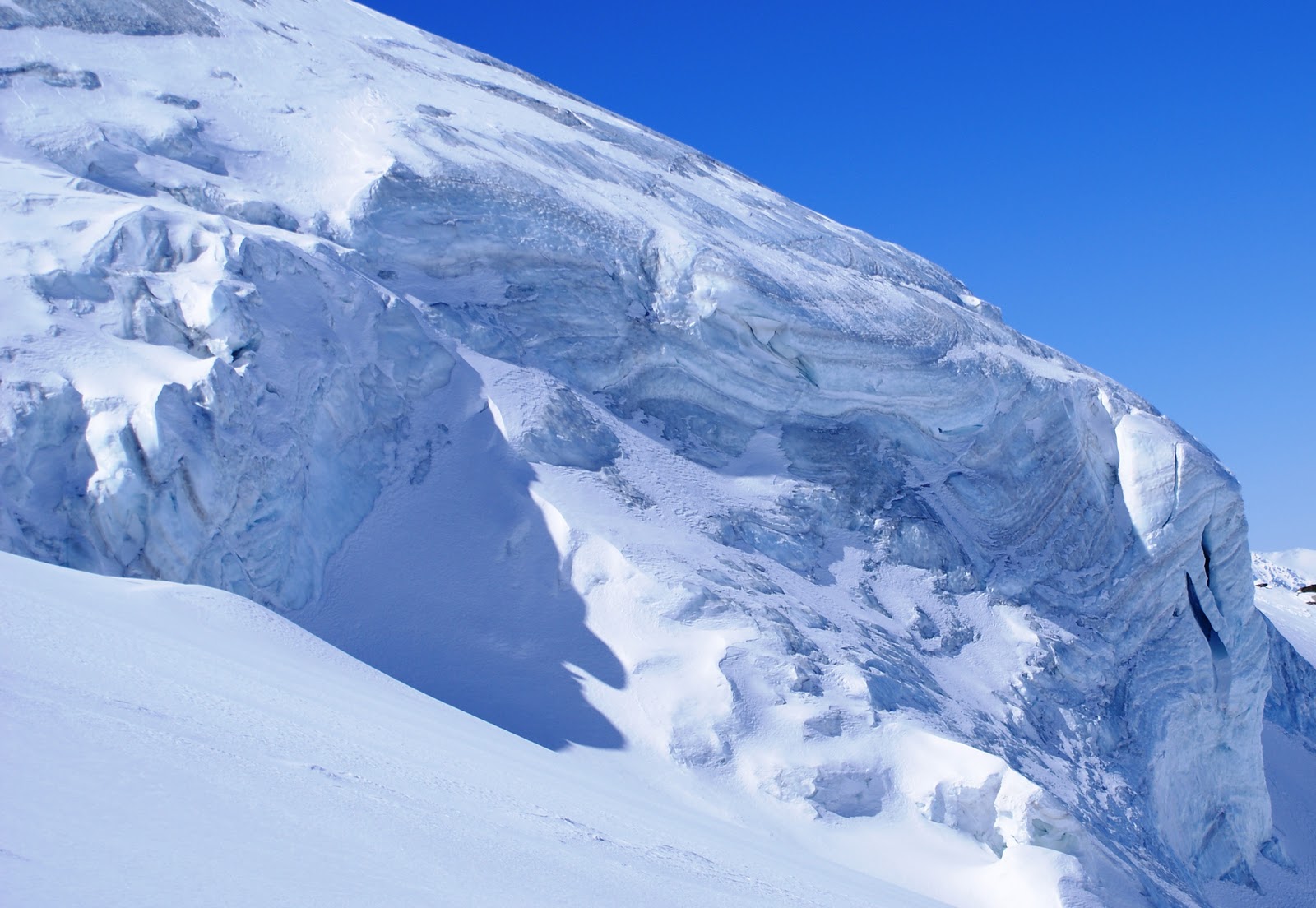 Au départ, c’est juste pour me réchauffer… Puis je vois que je monte vite et décide de pousser jusqu’au sommet. Le temps est superbe et avec la trace (l’autoroute?) faite, ça monte vite. Même les crevasses sont signalées par des fanions, témoins d’une course récente!