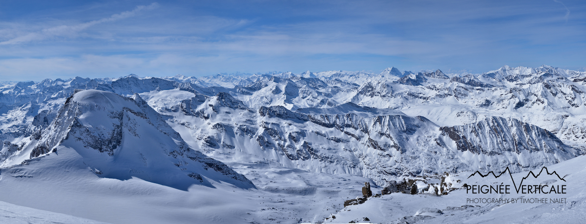 La descente (sur la voie classique, côté refuge Vittorio Emmanuele II) est superbe, malgré une neige très changeante > poudre, glace, transfo, soupe.