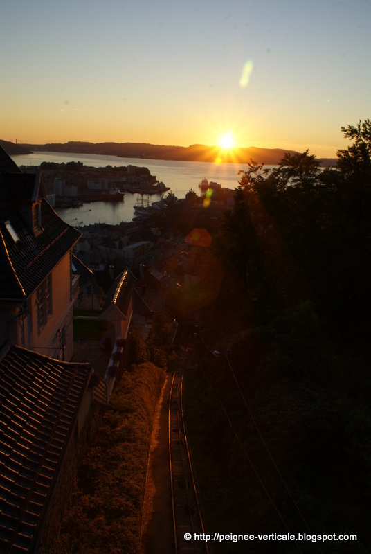 On prend un premier repas dans la cuisine commune de l’appartement puis on retourne sur les hauteurs pour apprécier le coucher de soleil magique sur Bergen et son port.