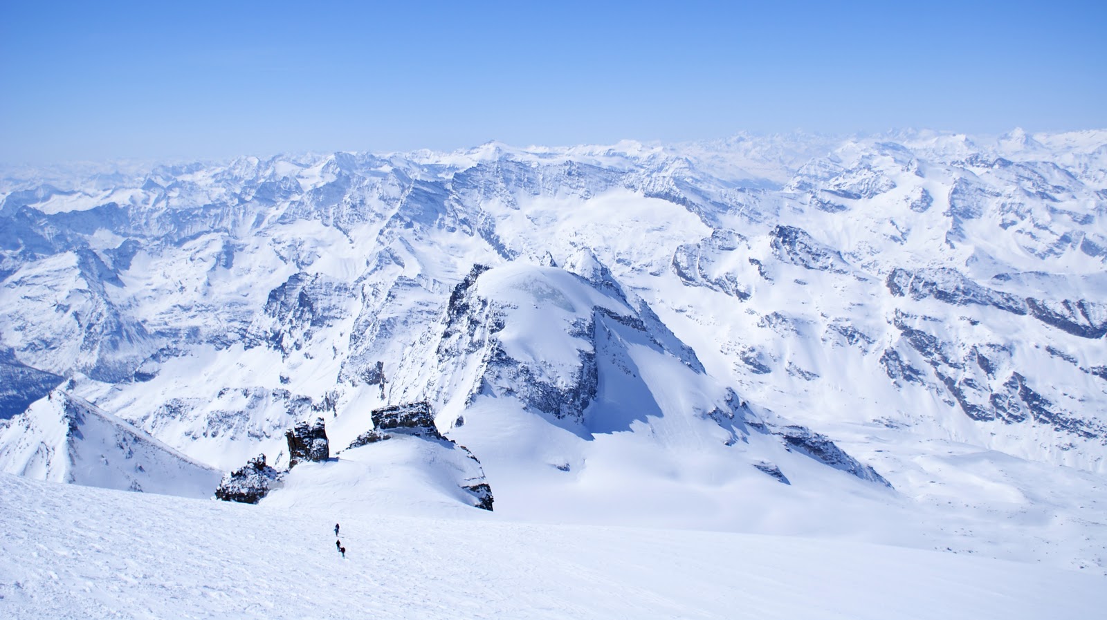 Après une nuit en refuge, nous attaquons l’ascension vers 6h du matin. L’Equipe attaque un couloir inaccessible à mon niveau, j’irai tout seul au sommet, à 4061m. A l’époque, j’étais le roi du monde là haut 🙂