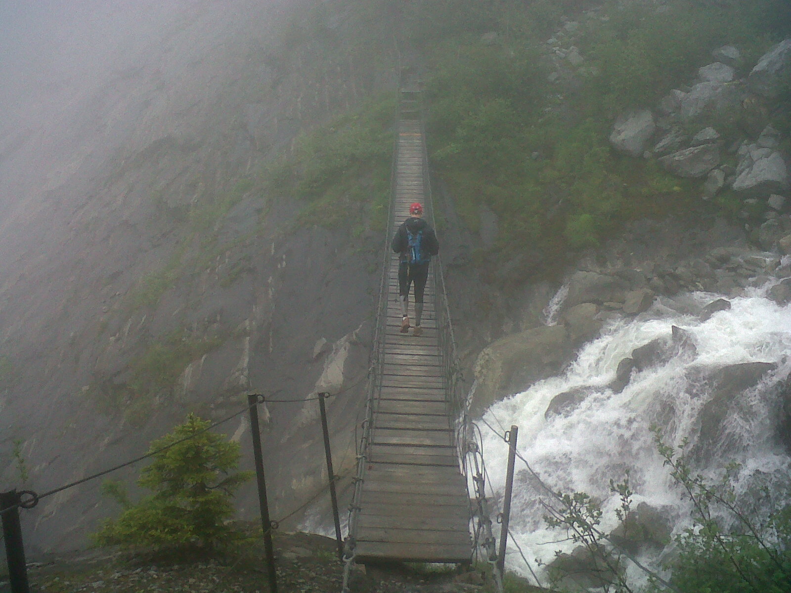 Départ des Houches à 15h samedi sous la pluie, qui ne nous quittera pas jusqu’au lendemain… On enchaine assez rapidement Col de Voza, col de Tricot, chalets de Miage et on en entame la descente vers les Contamines. Tout ce passage est certainement superbe mais nous n’y voyons pas à 100m.