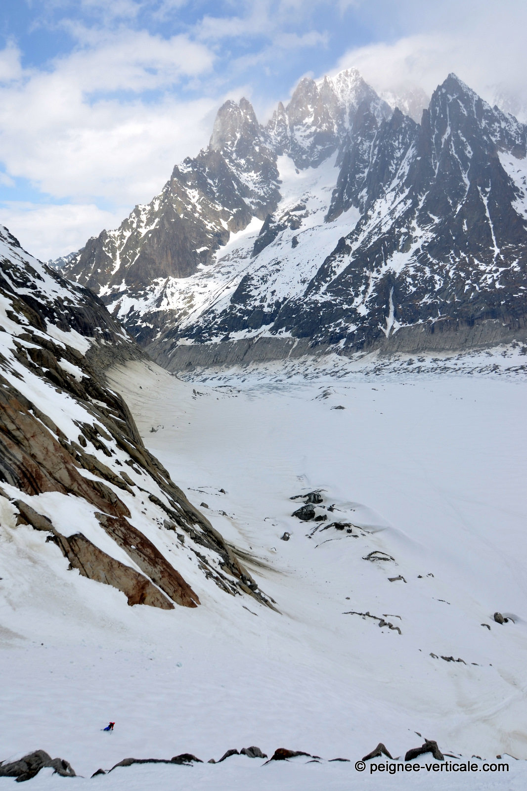 En arrivant sur la Mer de Glace, vers 2000m, le spectacle est de plus en plus désolant. Ces faces Sud dégarnies et ces faces Nord grisâtres tout en glace rappellent que ce début d’hiver généreux en neige n’a pas comblé les énormes déficits de ces dernières années.